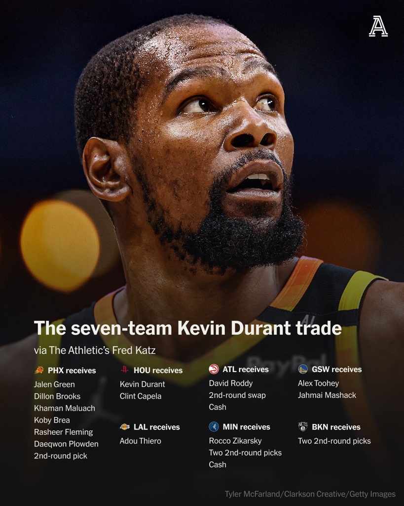 火箭今日官方宣布,通过一笔涉及亚特兰大老鹰、布鲁克林篮网、金州勇士、洛杉矶湖人、明尼苏达森林狼及菲尼克斯太阳的七方交易,正式得到了前锋凯文-杜兰特和中锋克林特-卡佩拉。