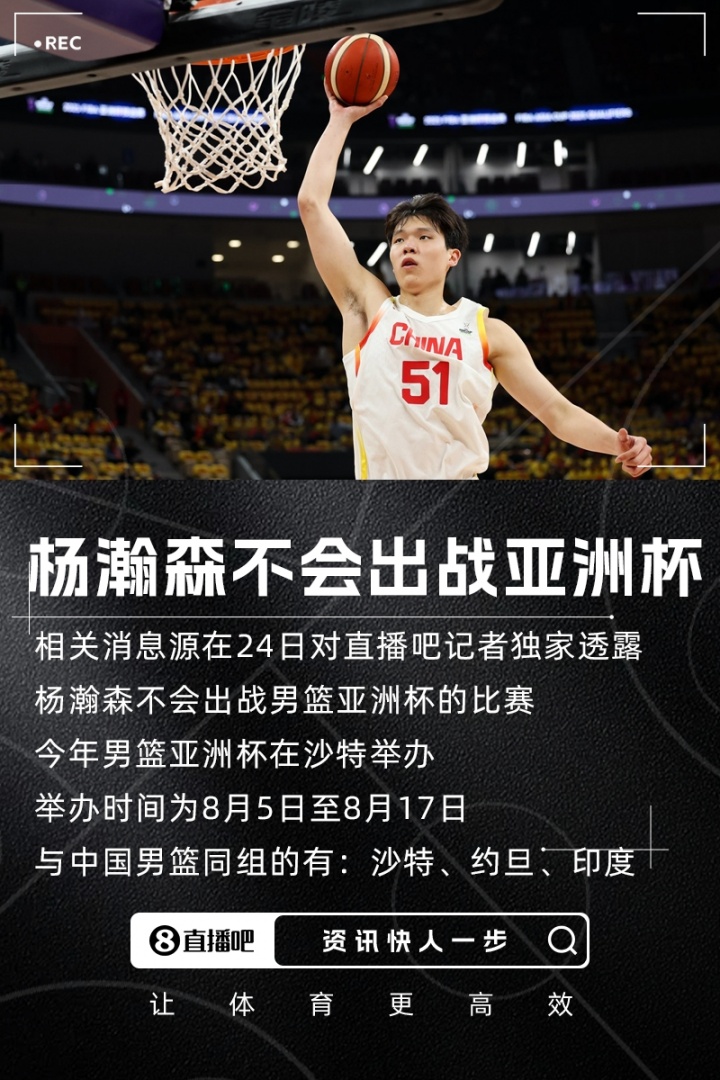相关消息源在24日对记者独家透露,杨瀚森不会出战男篮亚洲杯的比赛。