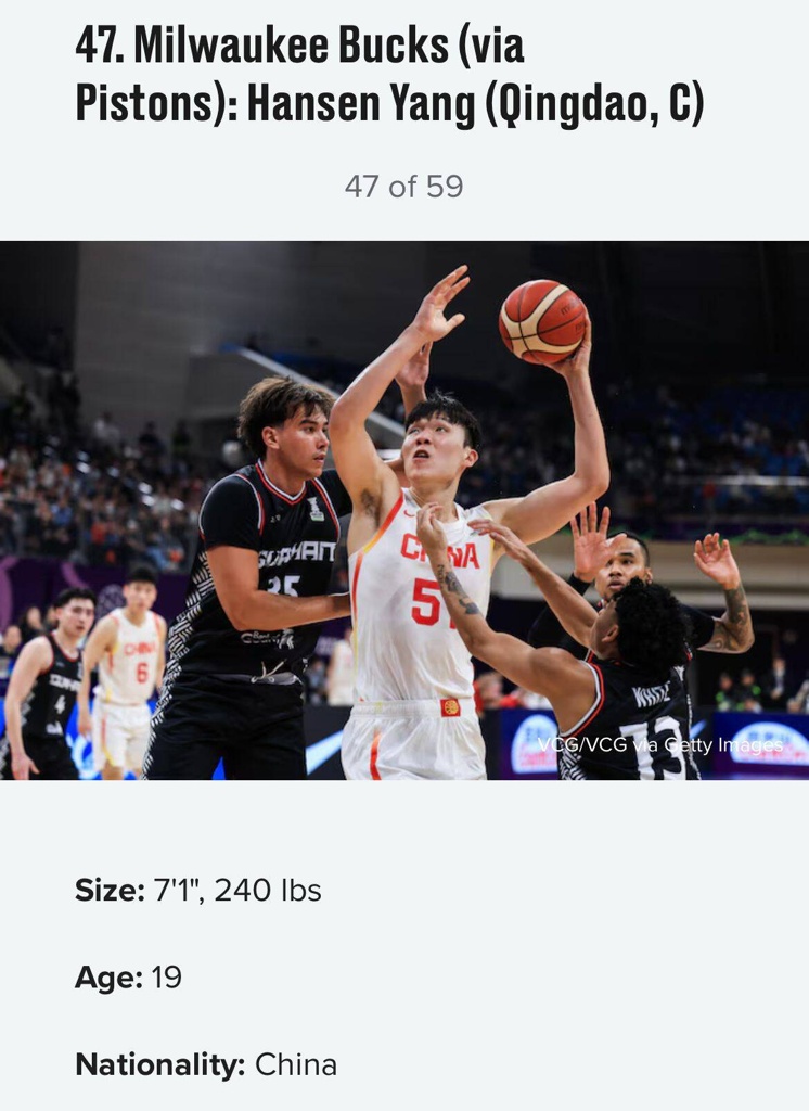 相关新闻:冲冲冲知名美媒模拟选秀:雄鹿47号签选杨瀚森 顺位历史新高