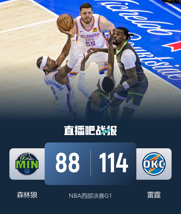 首节对决双方立足防守打出胶着局势,雷霆单节6次抢断不断制造对手失误,但进攻端受困外线打不开导致进攻更多依赖亚历山大造杀伤拿分;森林狼方面则拼抢积极单节多出8个篮板且命中5记三分抢占主动权。次节两队依旧高强度压迫防守,双方半场命中率和三分命中率都低于四成,森林狼末段依靠爱德华兹连拿5分短暂拉开9分优势,雷霆则在读秒阶段连续冲击篮下追至4分进入下半场。休息归来森林狼前期依旧占据主动,但之后状态突然回落,雷霆疯狂压缩内线策略明确且收到效果,进攻端杰伦威和亚历山大联手拿下10分帮助球队送上10-0的攻势实现反超并在随后拉开至10分优势,而森林狼三节命中率已经下降至34%;末节亚历山大稳定抢分帮助球队确保两位数优势奠定胜局。最终,雷霆主场击败森林狼拔得头筹,总比分上1-0取得领先。