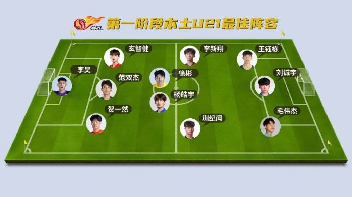 5月20日讯 中超进入间歇期,《足球》报评选出第一阶段本土U21最佳阵容,王钰栋、刘诚宇、蒯纪闻、毛伟杰在列。