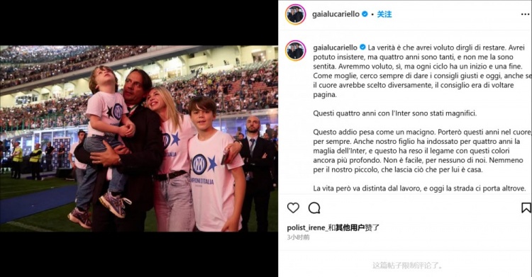 6月4日讯 不久前,小因扎吉的妻子更新了社交媒体,表达了对国米的祝福并透露了丈夫做出离任决定的原因。