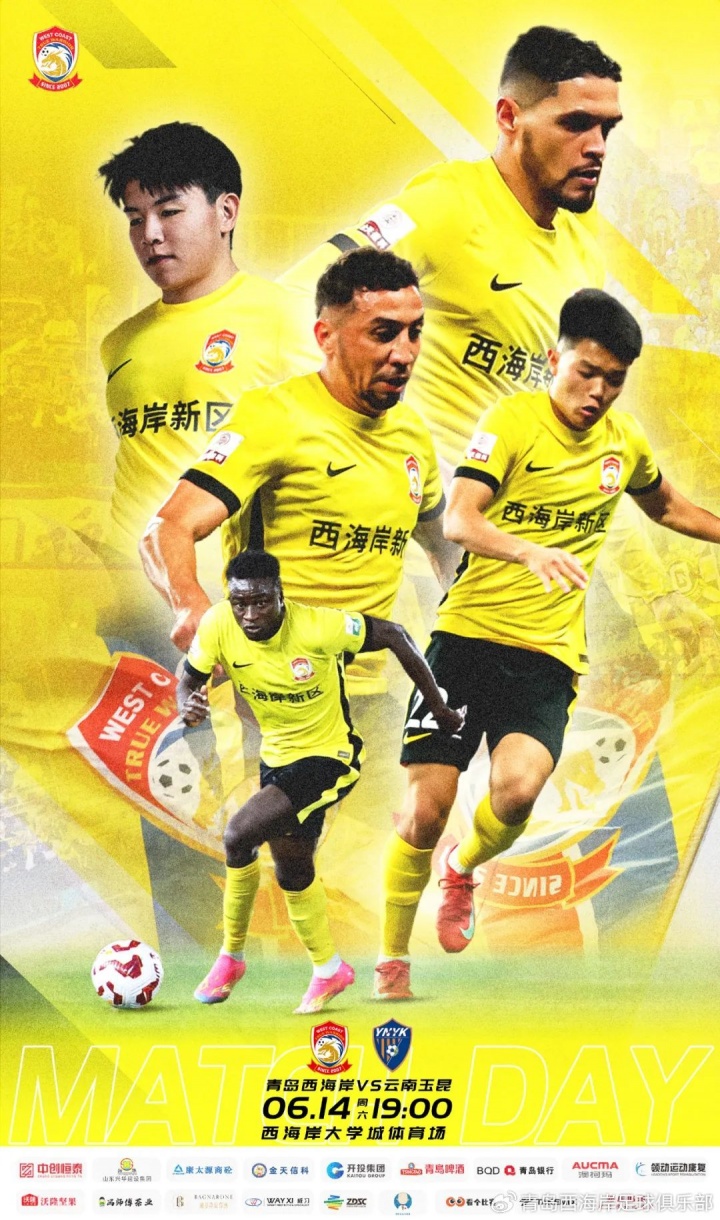 06月14日讯 北京时间19点,中超第14轮,青岛西海岸主场迎战云南玉昆,赛前双方公布首发。