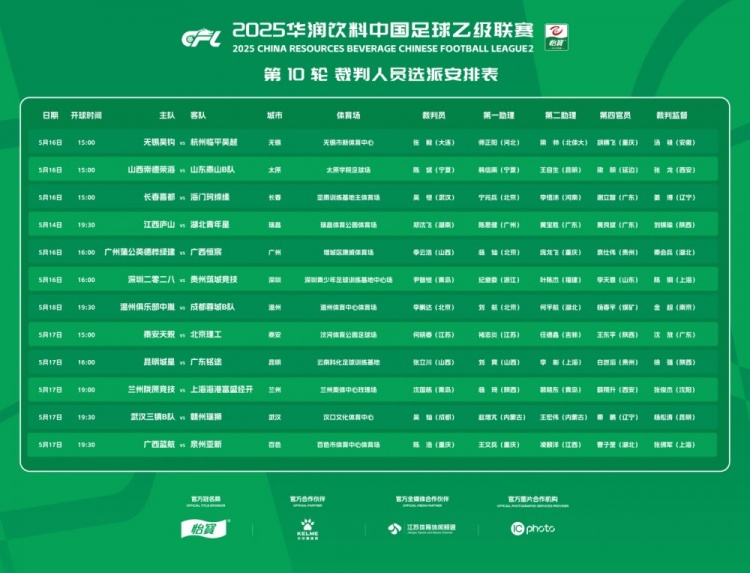 5月16日讯 中足联官方公布中乙第10轮裁判安排,沈国栋执法兰州陇原vs上海海港B队。