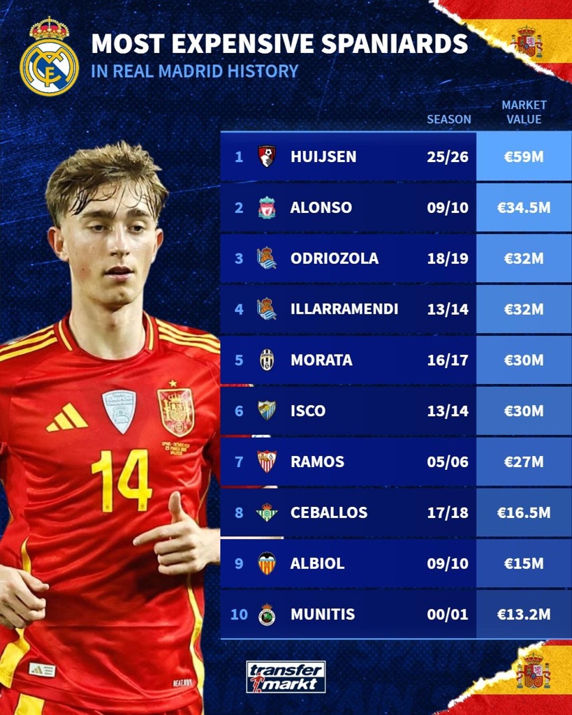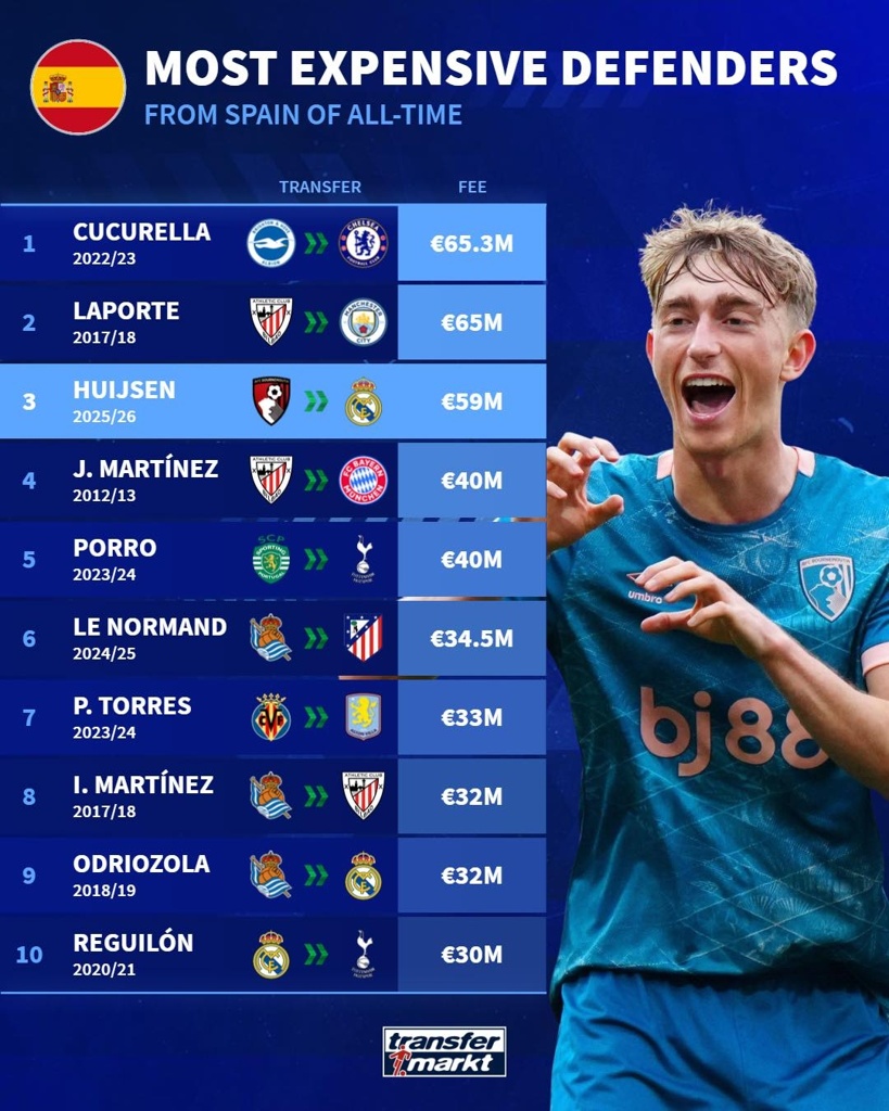 5月18日讯 近日,皇马官方宣布了从伯恩茅斯引进西班牙后卫怀森,据德转统计转会费为5900万欧元,创造了皇马引进西班牙球员的转会费纪录,同时也排在西班牙籍后卫转会费的第3位。