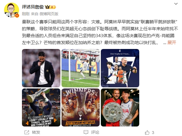05月22日讯 热刺1-0击败曼联,夺得欧联杯冠军。赛后,詹俊发文点评。