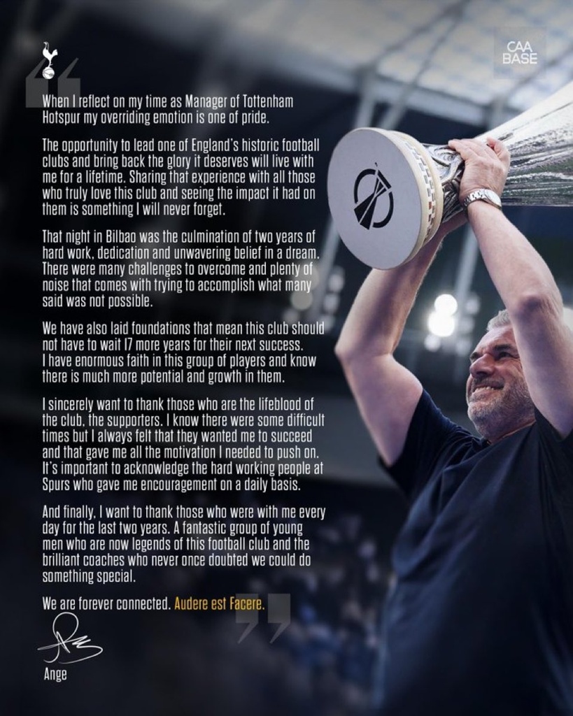 6月7日讯 热刺官方宣布主教练波斯特科格鲁下课。波斯特科格鲁更新社交媒体发长文深情告别热刺,澳波回顾两年热刺执教生涯满是自豪,并表示为热刺赢得欧联杯将终生难忘。