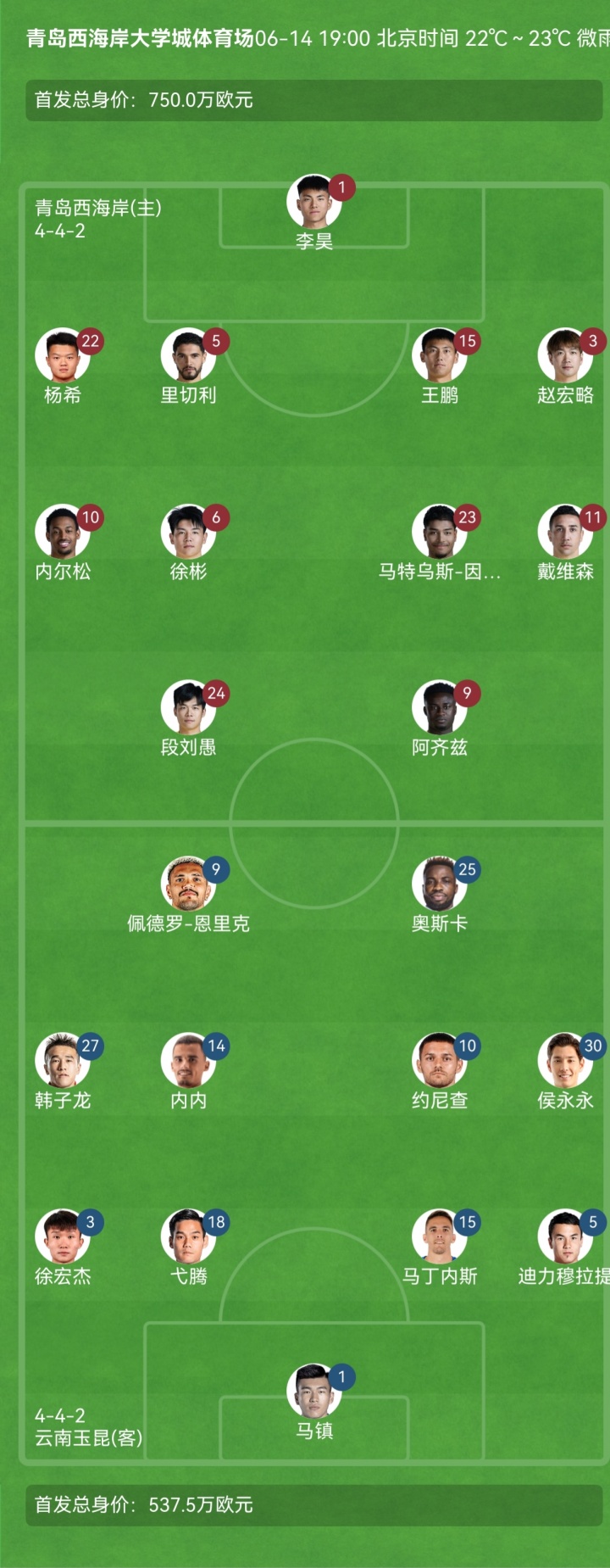 云南玉昆首发:1-马镇、3-徐宏杰、5-迪力穆拉提、15-马丁内斯(F)、18-弋腾、10-约尼查(F)、14-内内(F)、30-侯永永、9-佩德罗-恩里克(F)、25-奥斯卡(F)、27-韩子龙