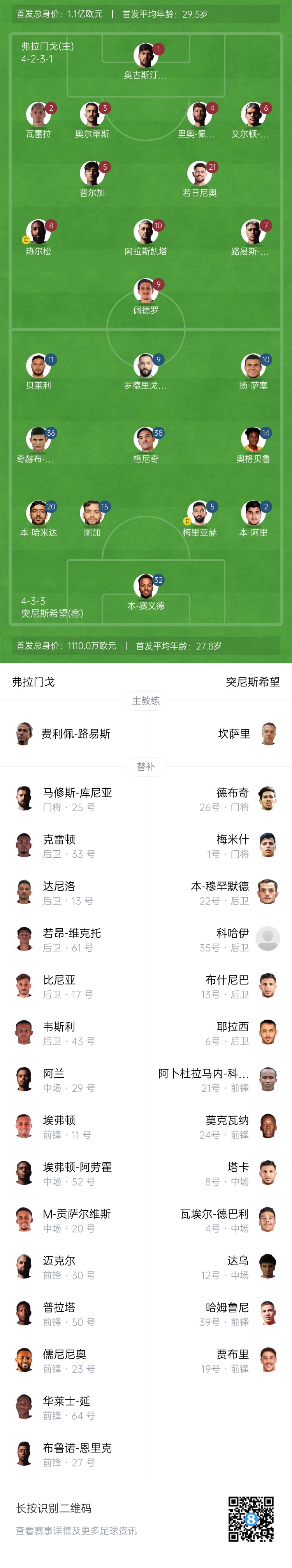 弗拉门戈首发:1-奥古斯汀-罗西、2-瓦雷拉、3-奥尔蒂斯、4-里奥-佩雷拉、6-艾尔顿-卢卡斯、5-普尔加、8-热尔松、10-阿拉斯凯塔、21-若日尼奥、7-路易斯-阿劳霍、9-佩德罗