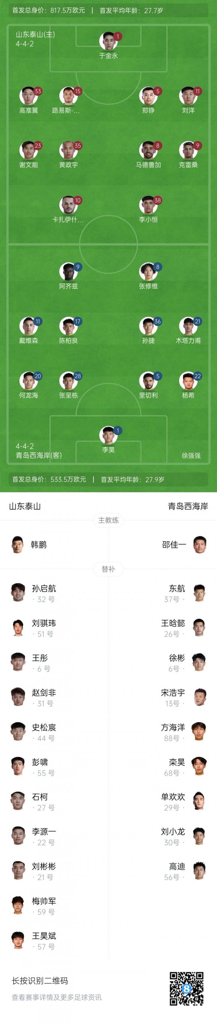 08月24日讯 北京时间今晚20点,山东泰山vs青岛西海岸,赛前首发阵容出炉!