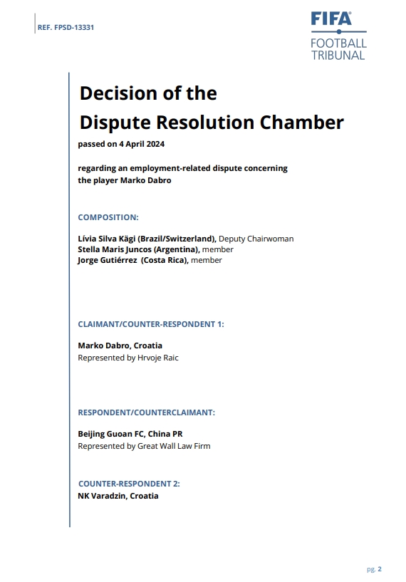 查询仲裁信息(有兴趣吧友可点击查看原文件/17页pdf),去年4月FIFA仲裁法庭曾就达布罗争议问题做出仲裁判定。